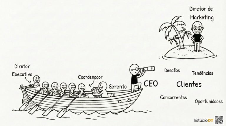 Assim como na imagem, enquanto o barco segue avançando, o Diretor de Marketing permanece estrategicamente posicionado fora da operação, observando o que ninguém tem tempo de olhar: